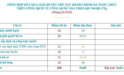 KẾT QUẢ GIẢI QUYẾT THỦ TỤC HÀNH CHÍNH XÃ NGỌC CHÚC TRÊN CỔNG DỊCH VỤ CÔNG QUỐC GIA THEO QUYẾT ĐỊNH 766/QĐ-TTg (Tháng 02/2026)