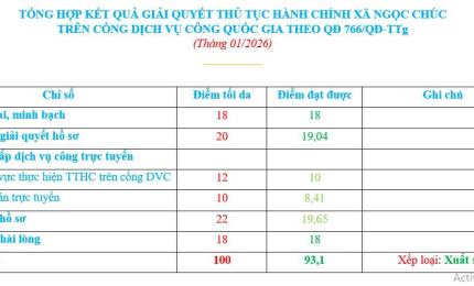 KẾT QUẢ GIẢI QUYẾT THỦ TỤC HÀNH CHÍNH XÃ NGỌC CHÚC TRÊN CỔNG DỊCH VỤ CÔNG QUỐC GIA THEO QUYẾT ĐỊNH 766/QĐ-TTg (Tháng 1/2026)