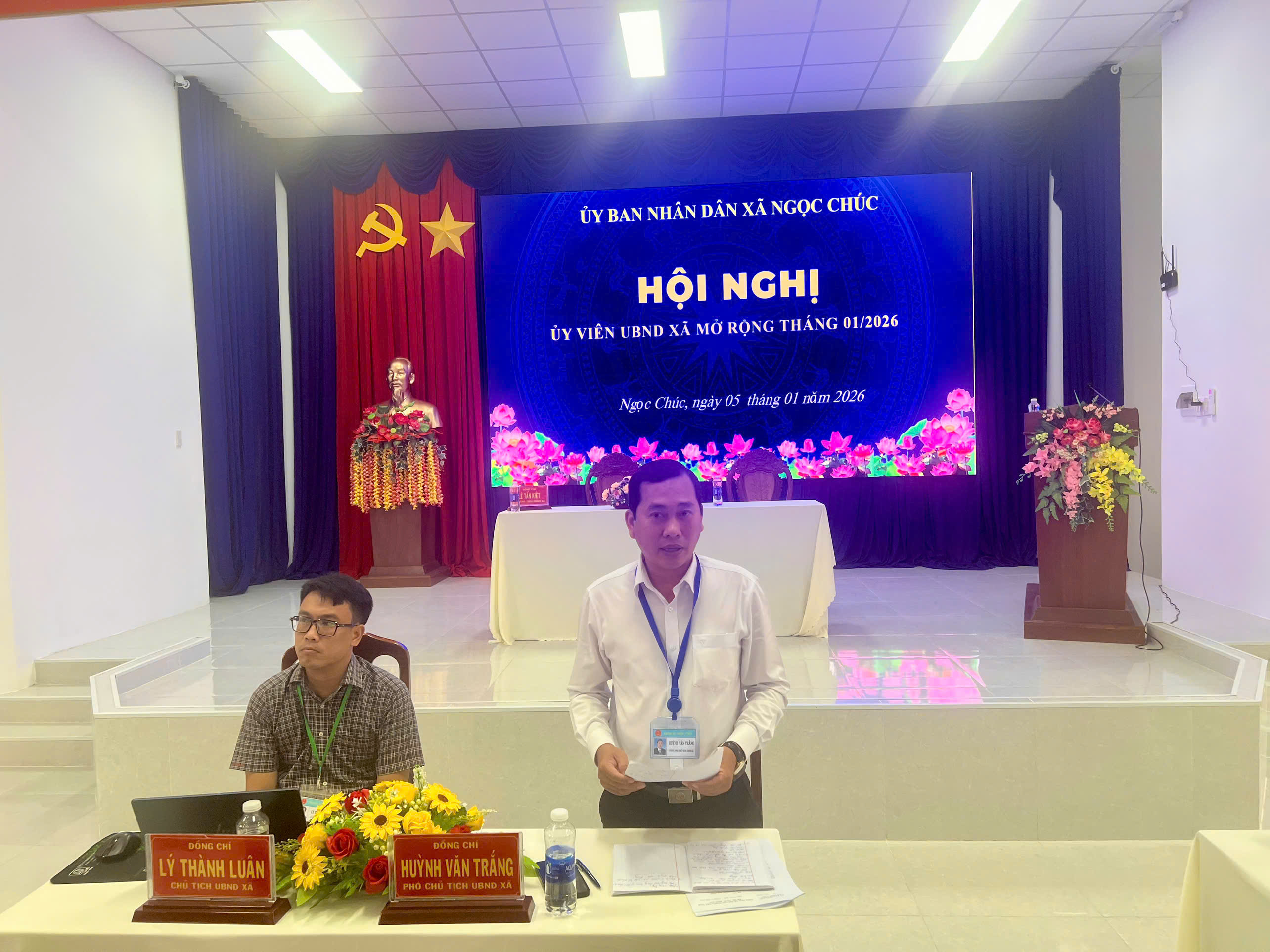 Sáng ngày 05/01/2026, xã Ngọc Chúc tổ chức hội nghị Uỷ viên UBND xã mở rộng nhằm đánh giá tình hình thực hiện nhiệm vụ thời gian vừa qua, đồng thời xem xét, quyết định một số nội dung quan trọng phục vụ phát triển kinh tế – xã hội và công tác chỉ đạo, điều hành của UBND xã trong thời gian tới. Đồng chí Lý Thành Luân, Phó Bí thư Đảng ủy, Chủ tịch UBND xã chủ trì hội nghị.Tham dự hội nghị có các đồng chí Phó Chủ tịch UBND xã; các đồng chí Trưởng, Phó các Phòng chuyên môn; Trung tâm phục vụ hành chính công xã.