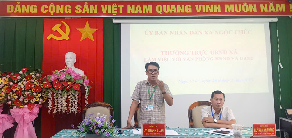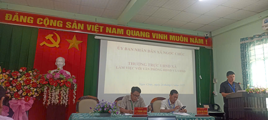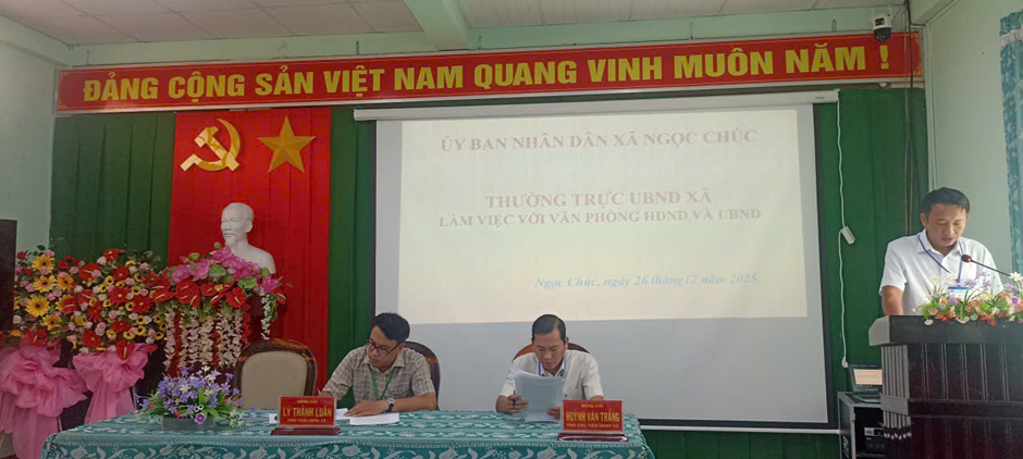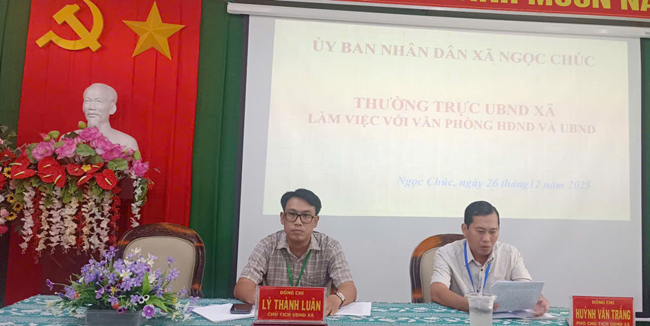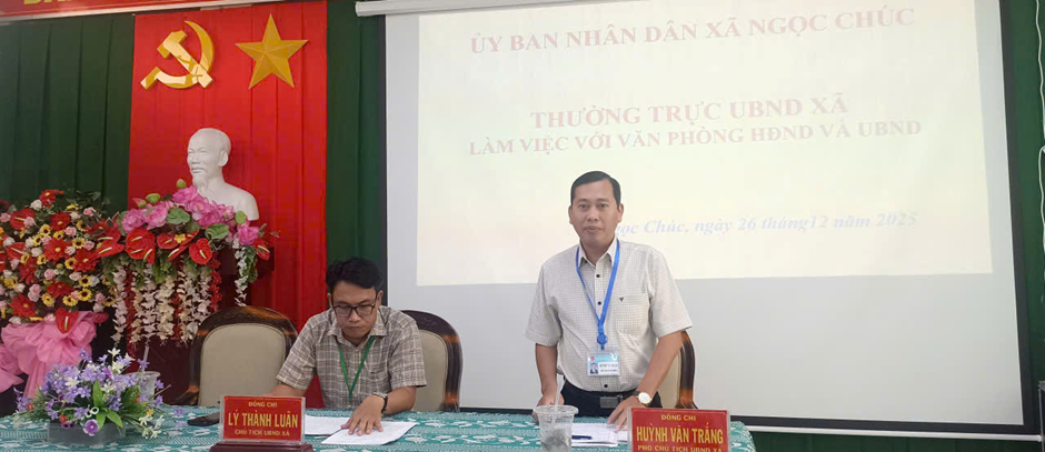 Chiều ngày 26/12/2025, Đồng chí Lý Thành Luân, Chủ tịch UBND xã chủ trì buổi làm việc của lãnh đạo UBND xã với Văn phòng HĐND và UBND xã. Tham dự phiên họp có đồng chí Huỳnh Văn Trắng Phó Chủ tịch UBND xã; lãnh đạo, chuyên viên Văn phòng HĐND và UBND xã.